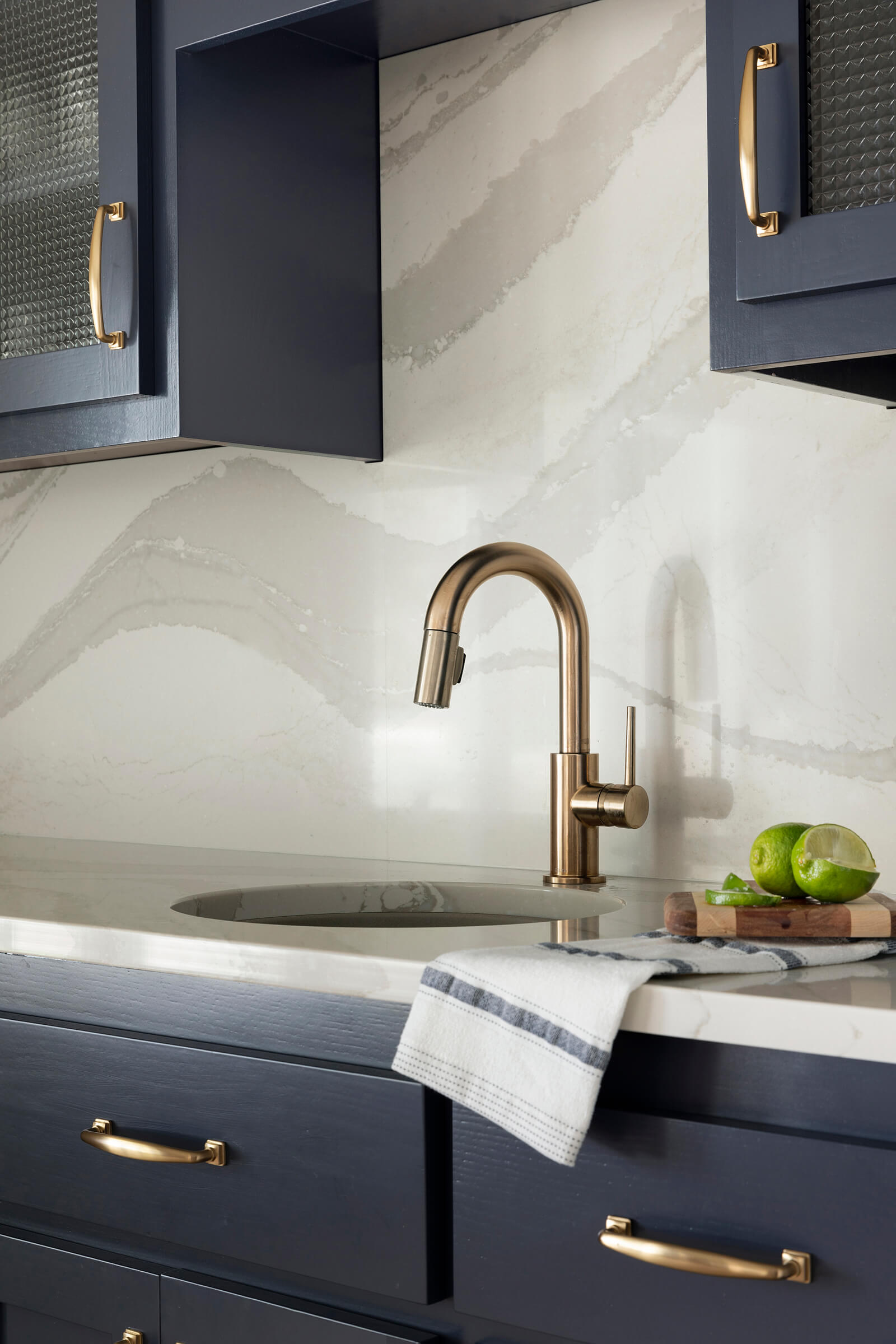 - Used creative space planning to dream up an area for each generation of the family – a whimsical corner for the youngest with books, an easel, and “play” in mind for rainy days or when they’ve had too much sun, and a well-appointed bar area for the adults, including a beverage fridge. The bar cabinets are dressed in Benjamin Moore Hale Navy and accompanied by Cambria quartz countertops in Brittanicca Warm and brushed gold fixtures and cabinet hardware.