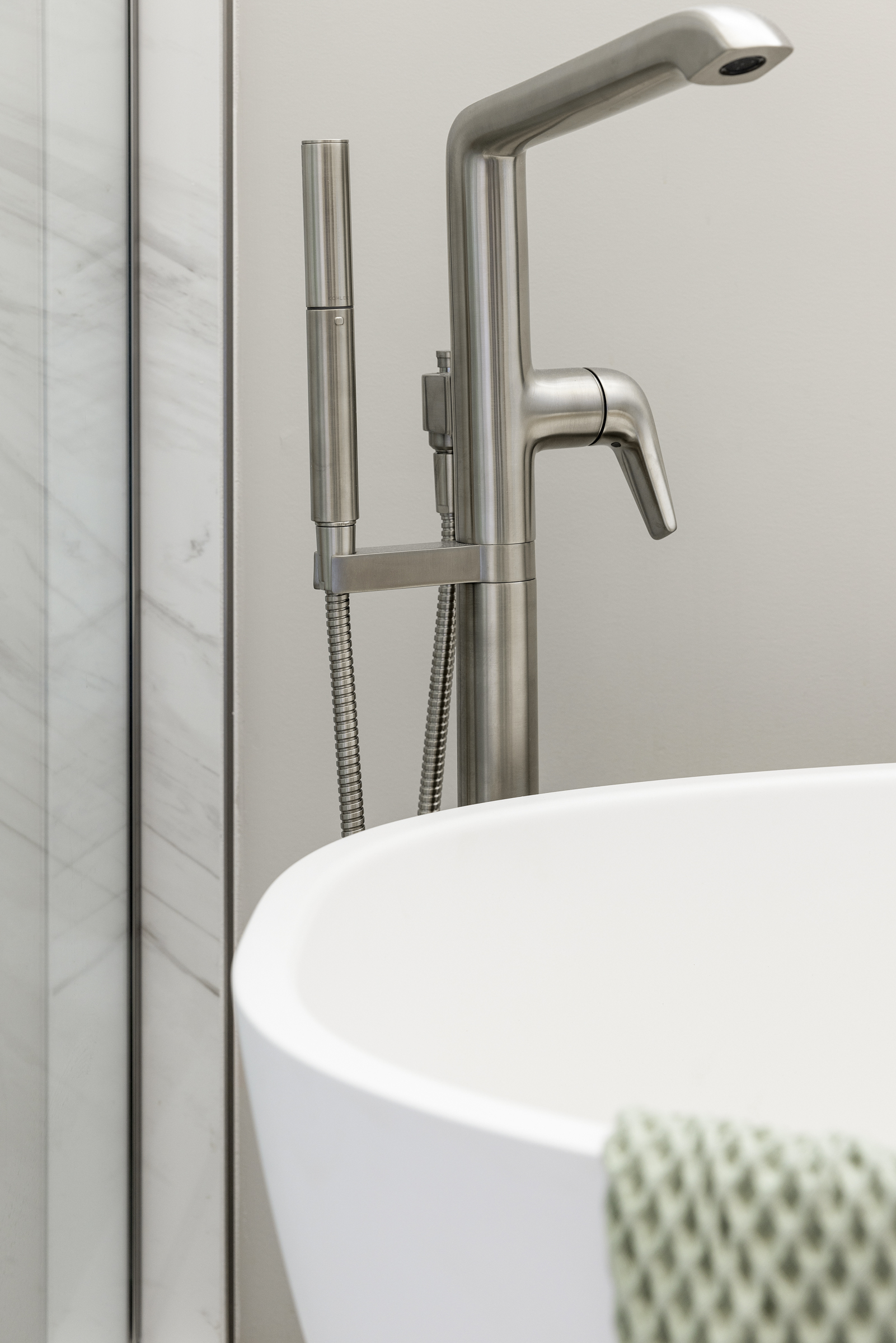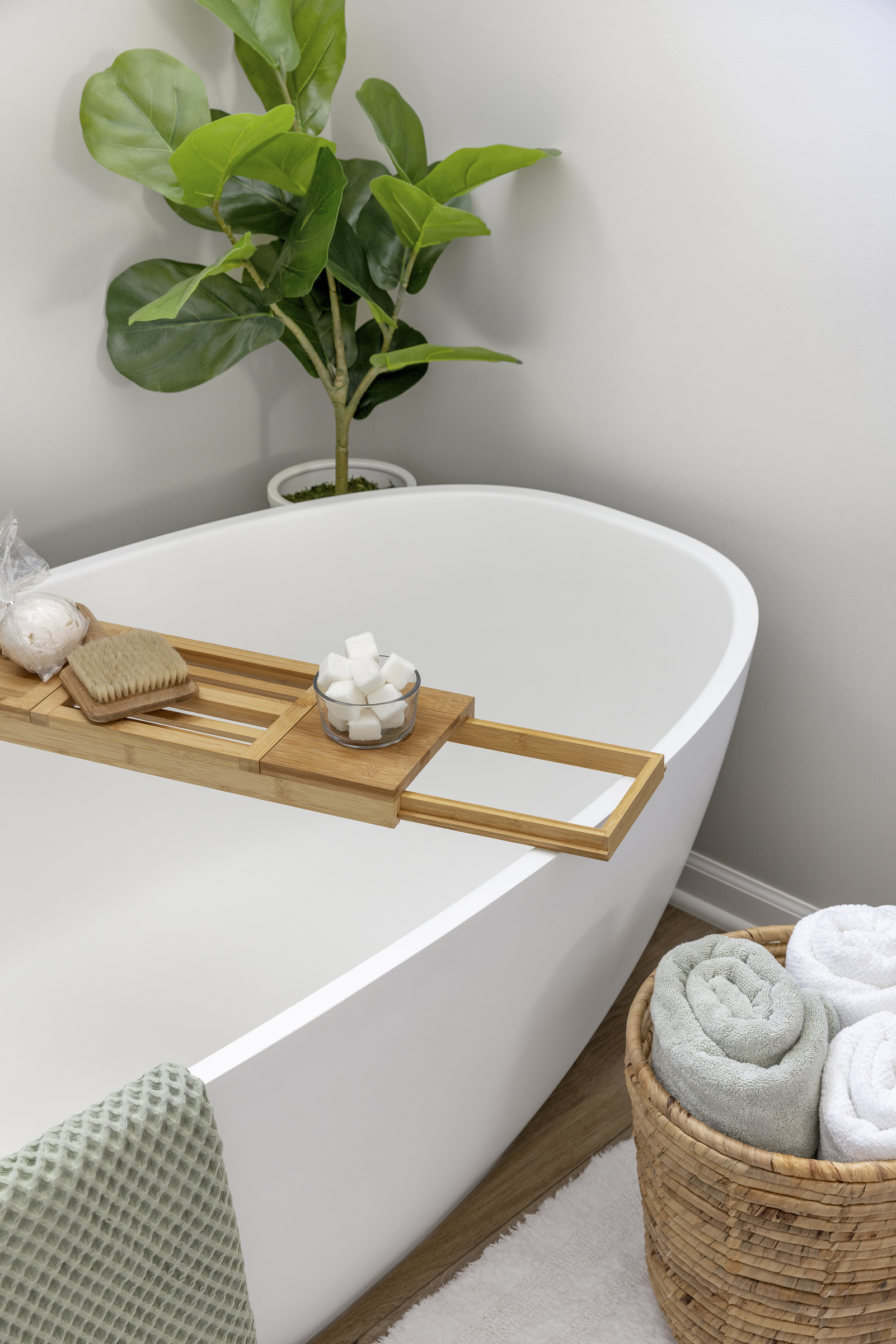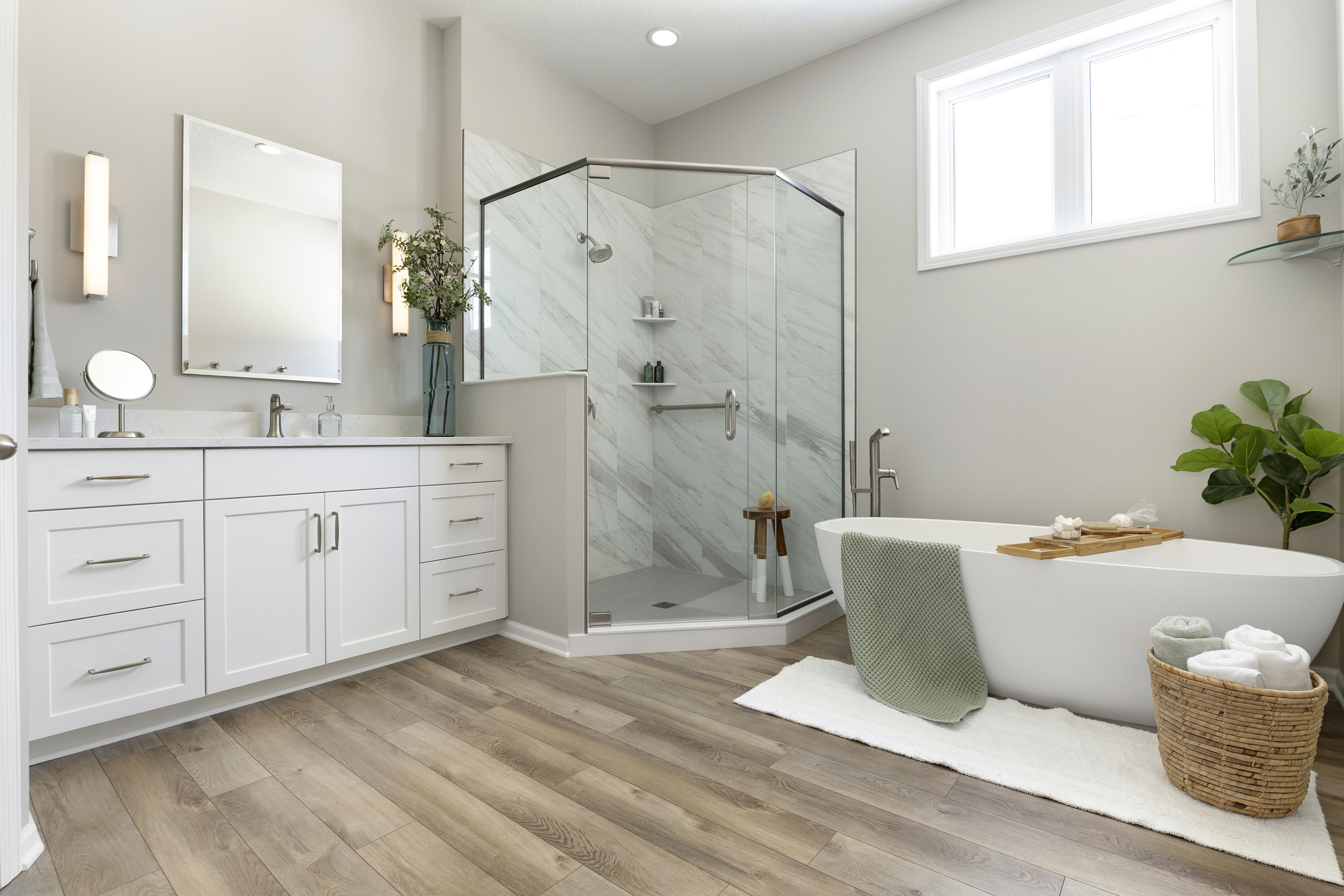 In addition, we transformed the owner’s bath suite into a luxe retreat, complete with an inviting soaking tub with a floor-mounted tub spout that makes you feel like you’re next to a waterfall. This 1980’s bathroom has been replaced with a modern, crisp aesthetic featuring white wood cabinets set against soft neutral gray walls, contemporary brushed nickel finishes, and beautiful LVP plank flooring in warm wood tones. The clean, simple lines throughout give this bath a spa-like feel. Even the mirrors were cleverly designed to set into the wall to maximize their function as medicine cabinets. This is the perfect place to indulge and relax right in the comfort of home.